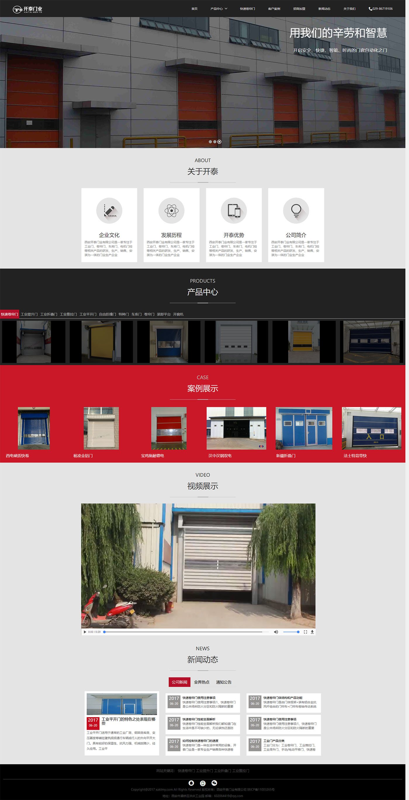 西(xī)安開(kāi)泰門(mén)業(yè)有(yǒu)限公司是(shì)一(yī)家(jiā)專注于工(gōng)業(yè)門(mén)、卷簾門(mé↑n)、車(chē)庫門(mén)、電(diàn)機(jī)門(mén)控等相(xiàng)關産品的(de)研發、生(shēng)α産、銷售、安裝為(wèi)一(yī)體(tǐ)的(de)門(mén)業(yè)生(shēng)産企業(yè)。